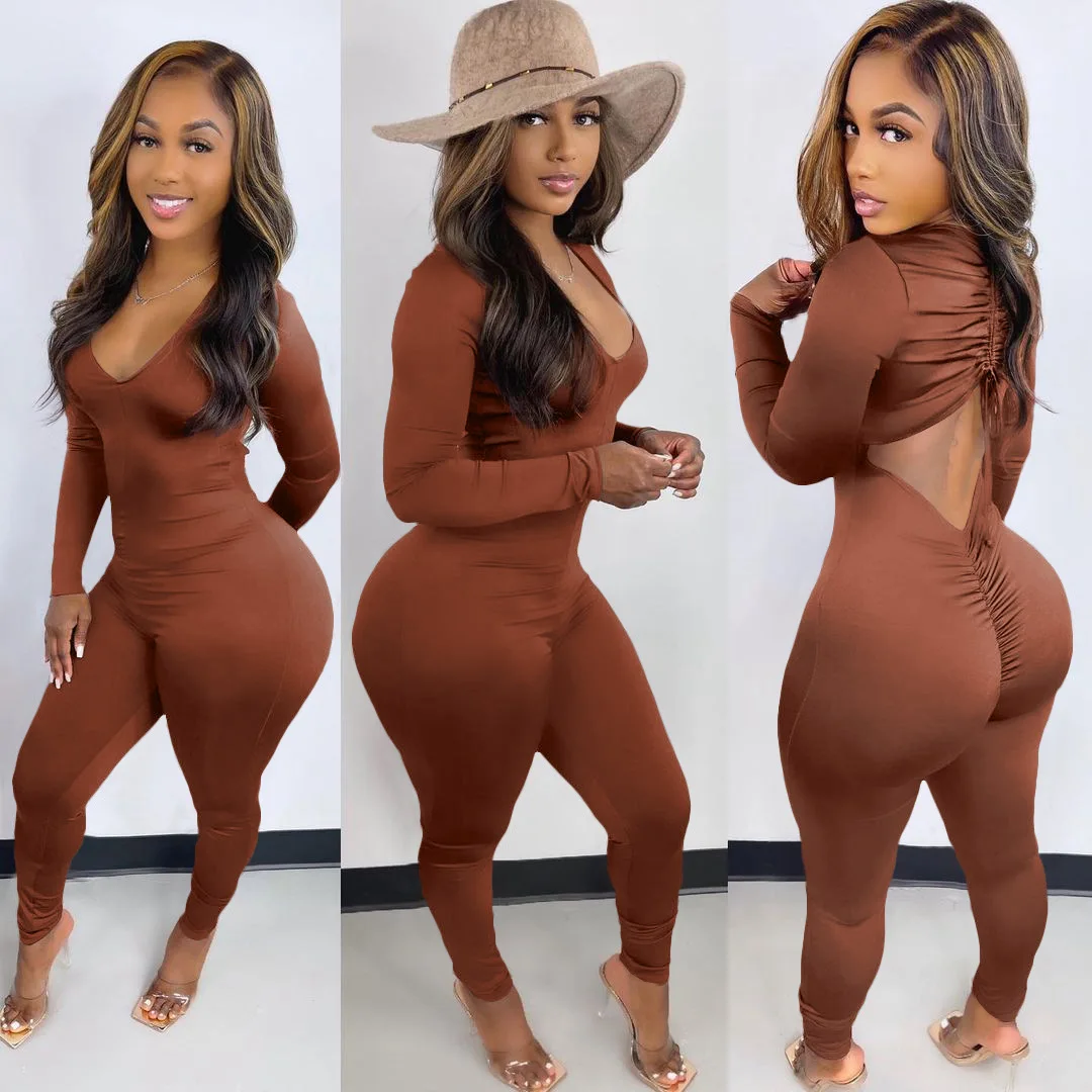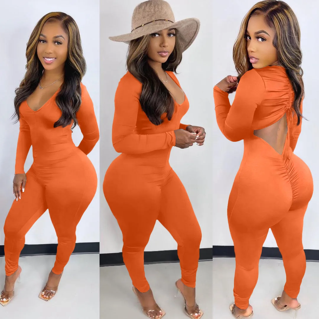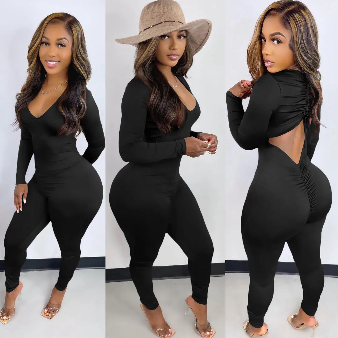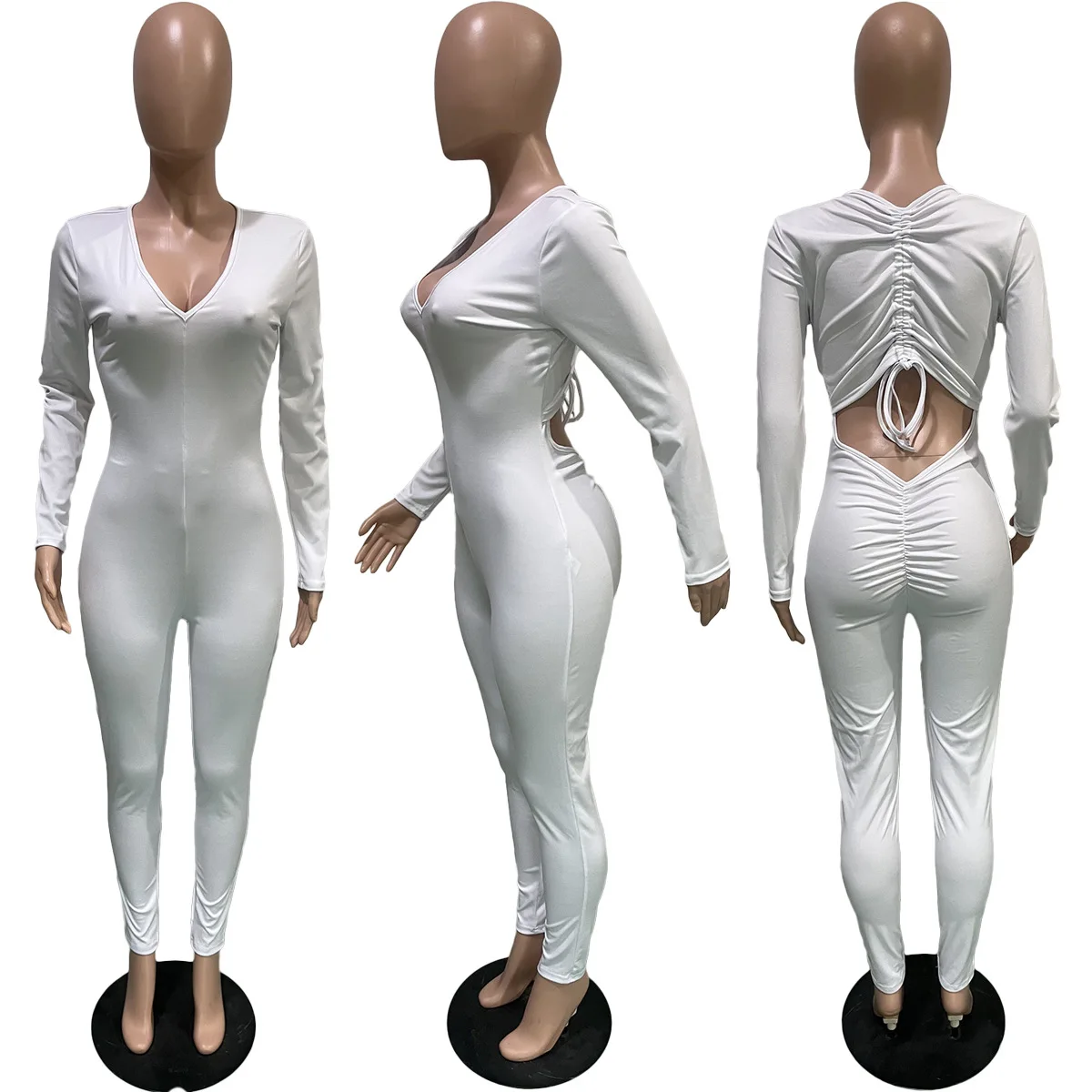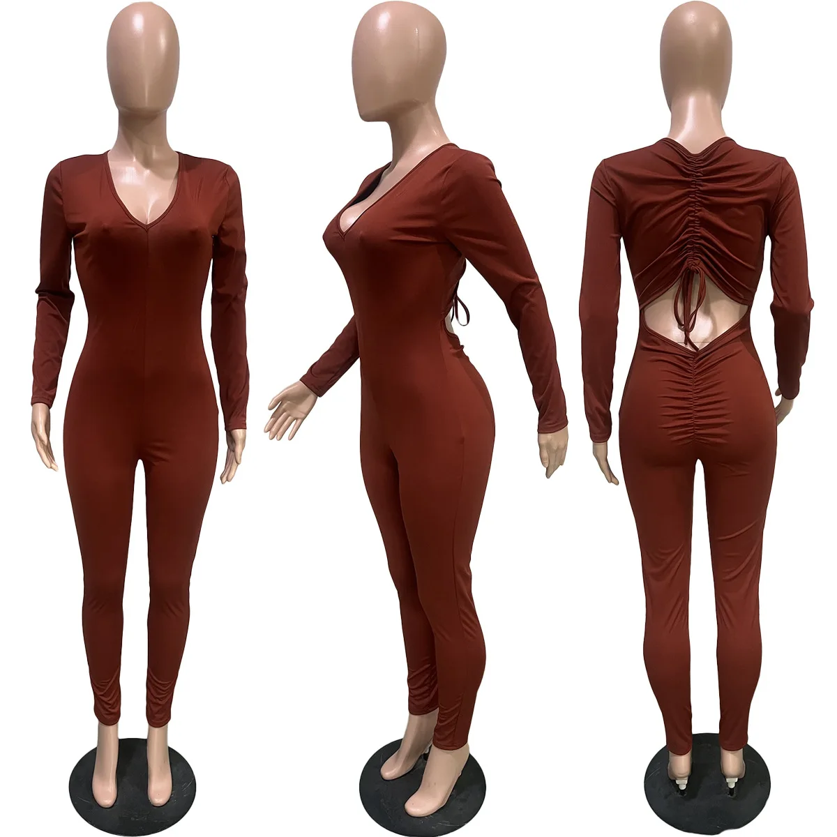 2023 Women Sexy Fall Clothes Cut Out Jumpsuits Long Sleeve V Neck String Pleat Back Slim Jumpsuit |